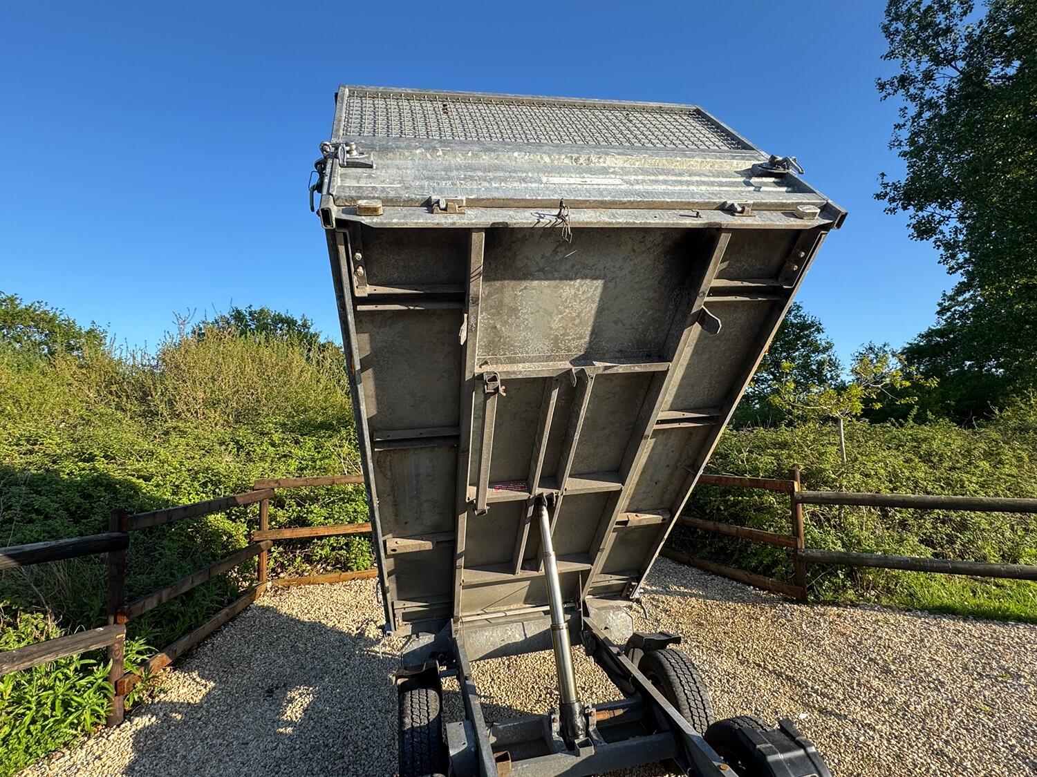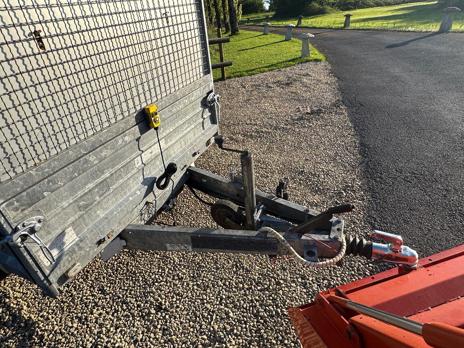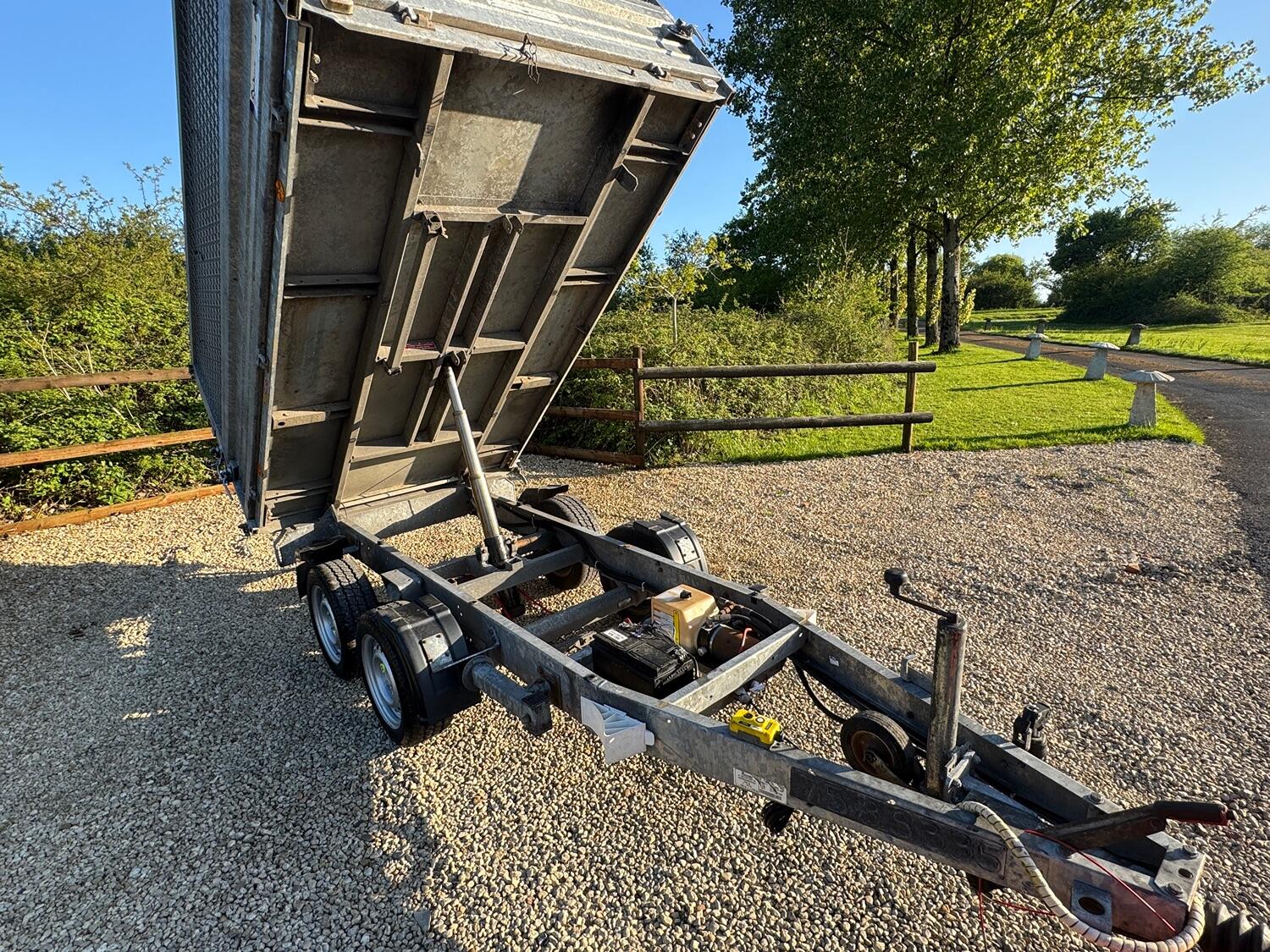 Indespention caged electric/Manual tipping trailer, four wheel breaking led 13 pin lights , regularly maintained, internal dimensions 8ft 5 by 5ft, 1922 kg payload.